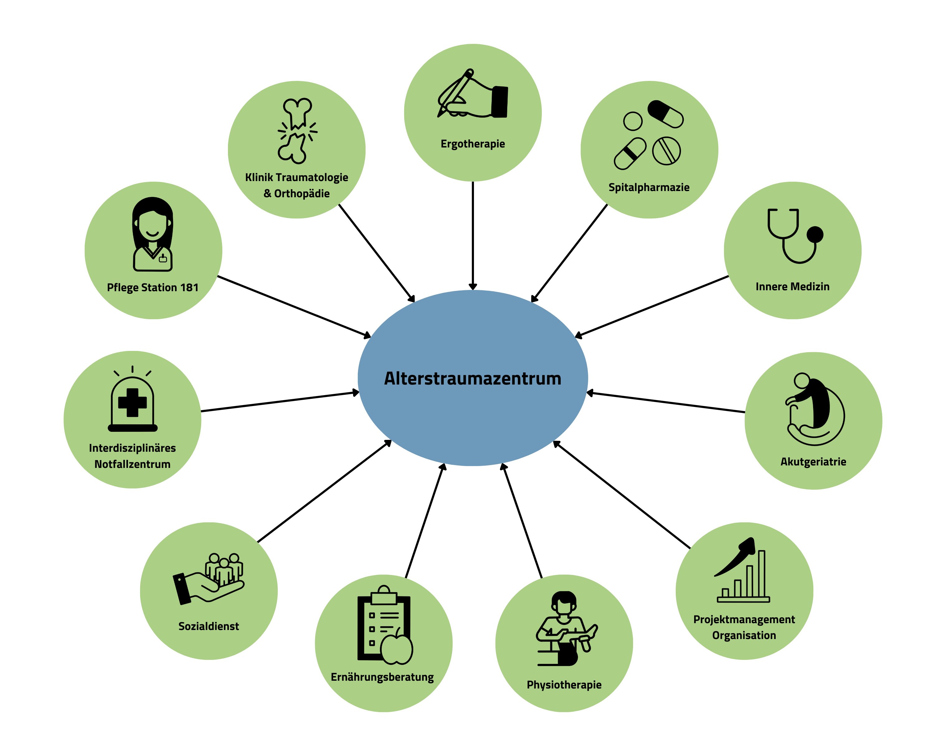 Das Alterstraumazentrum vereint Expertinnen und Experten aus unterschiedlichen Disziplinen, um eine ganzheitliche und patientenzentrierte Betreuung sicherzustellen. Von der Akutgeriatrie über die Pflege und Physiotherapie bis hin zur Sozialberatung und Ernährungsberatung – jedes Element trägt dazu bei, ältere Patientinnen und Patienten optimal zu unterstützen. Die koordinierte Zusammenarbeit der verschiedenen Bereiche ermöglicht es, auf die individuellen Bedürfnisse und Herausforderungen älterer Menschen einzugehen und eine nachhaltige Genesung zu fördern.